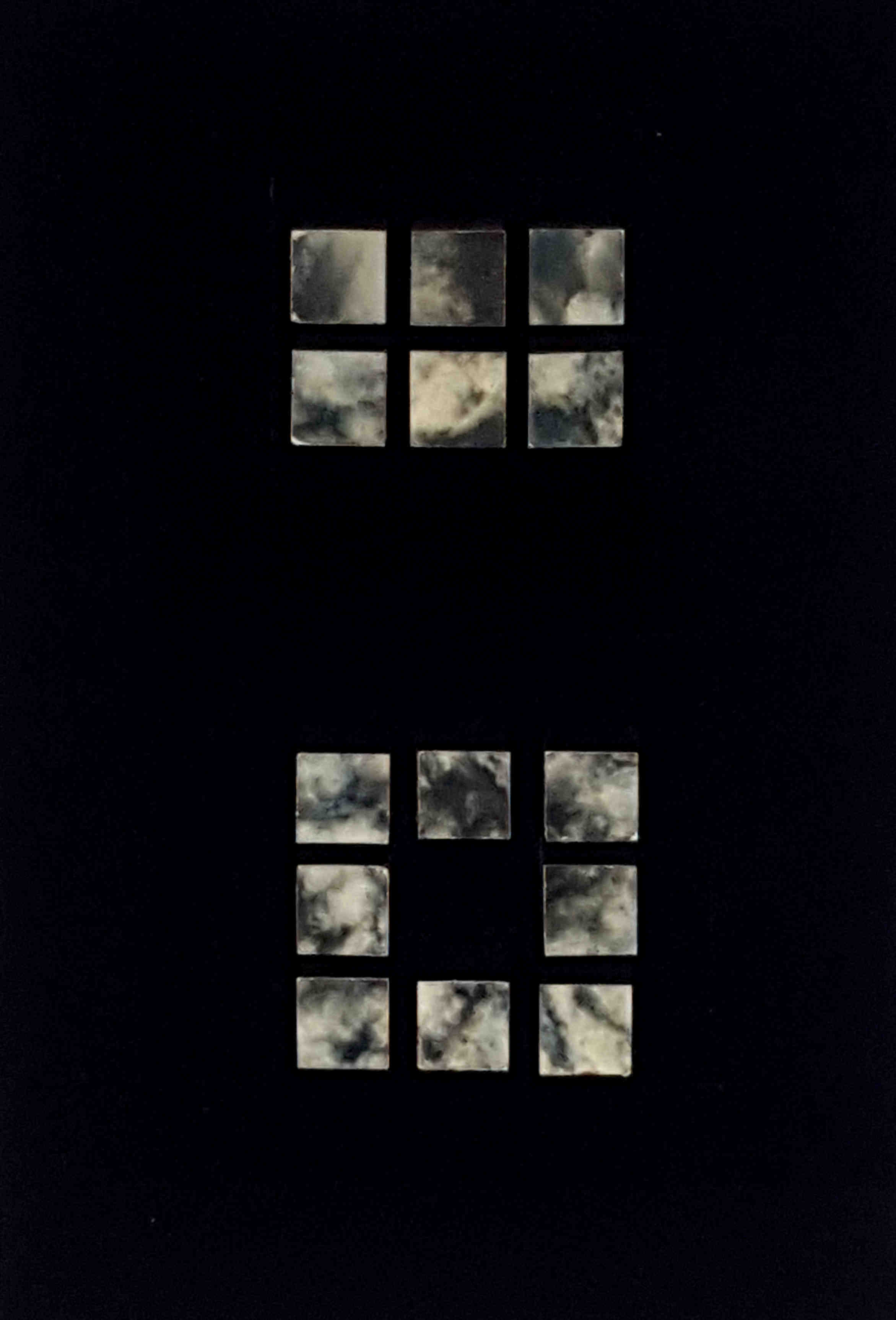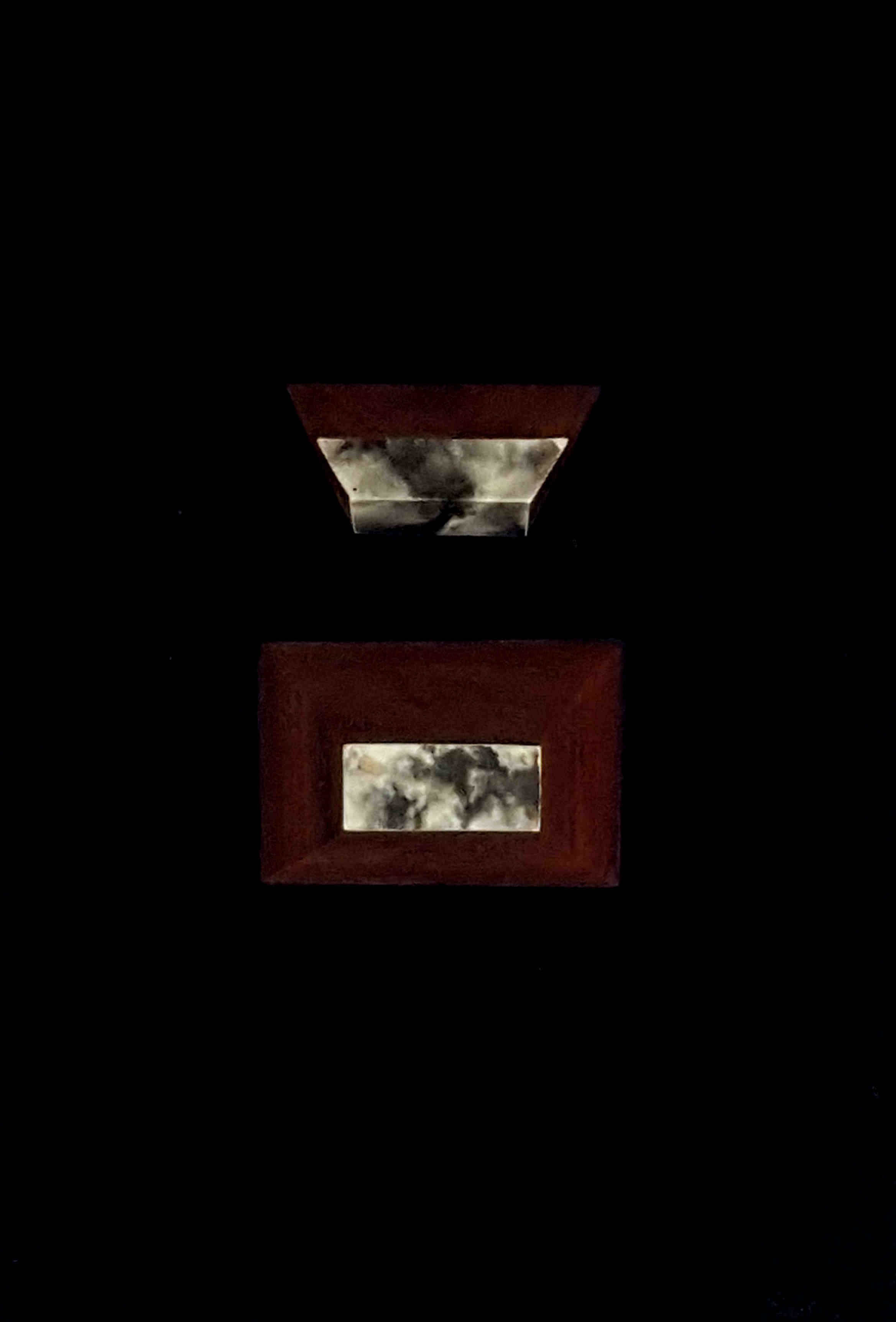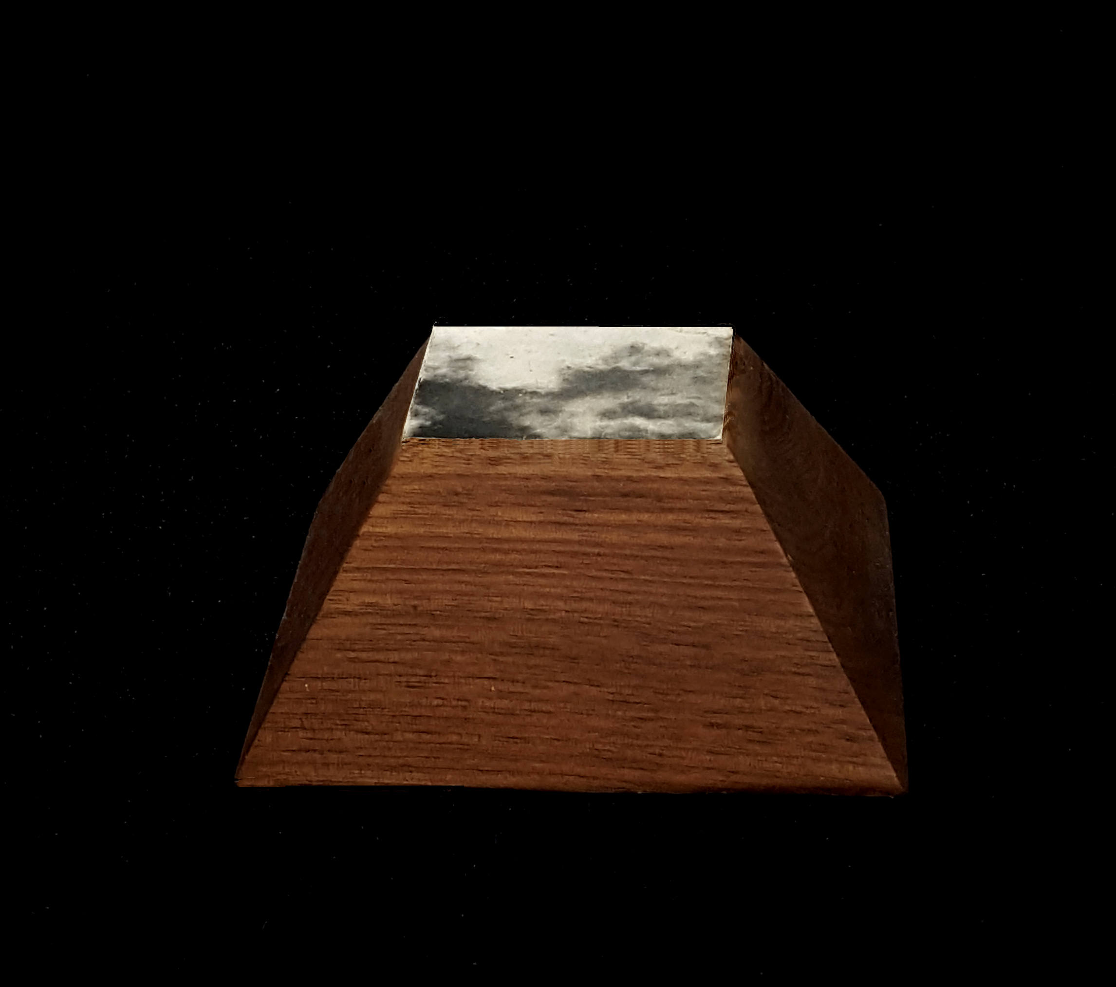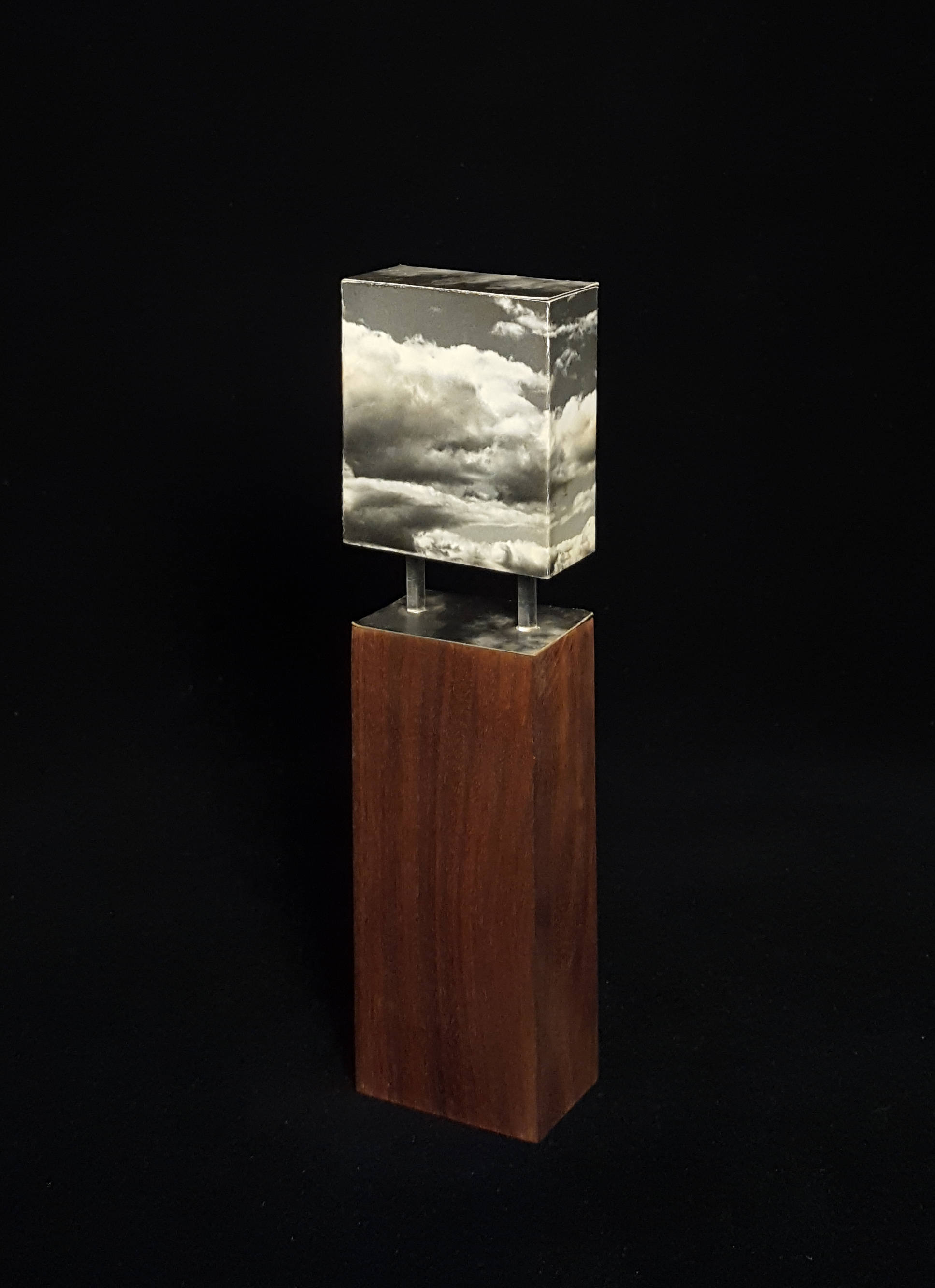 Two cloud photographs are mounted on a walnut pyramid and trapezoid and displayed on a black acrylic base. This work is a metaphor for the temporal impermanence.of cloud phenomena frozen in two instants of time and separated from their natural environment.